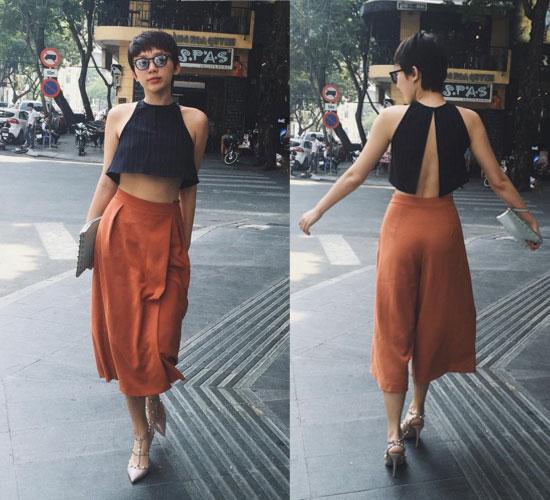 phần lưng xẻ gợi cảm kết hợp với quần ống rộng, sandals cao gót.