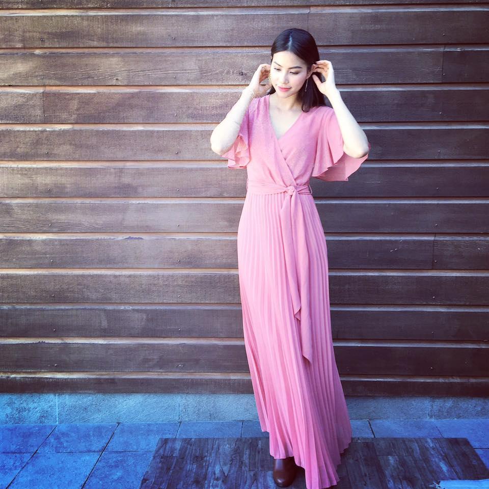 Váy tông màu đơn sắc, thiết kế dáng dài điệu đà rất phù hợp với những cô gái có chiều cao lý tưởng như Phạm Hương.