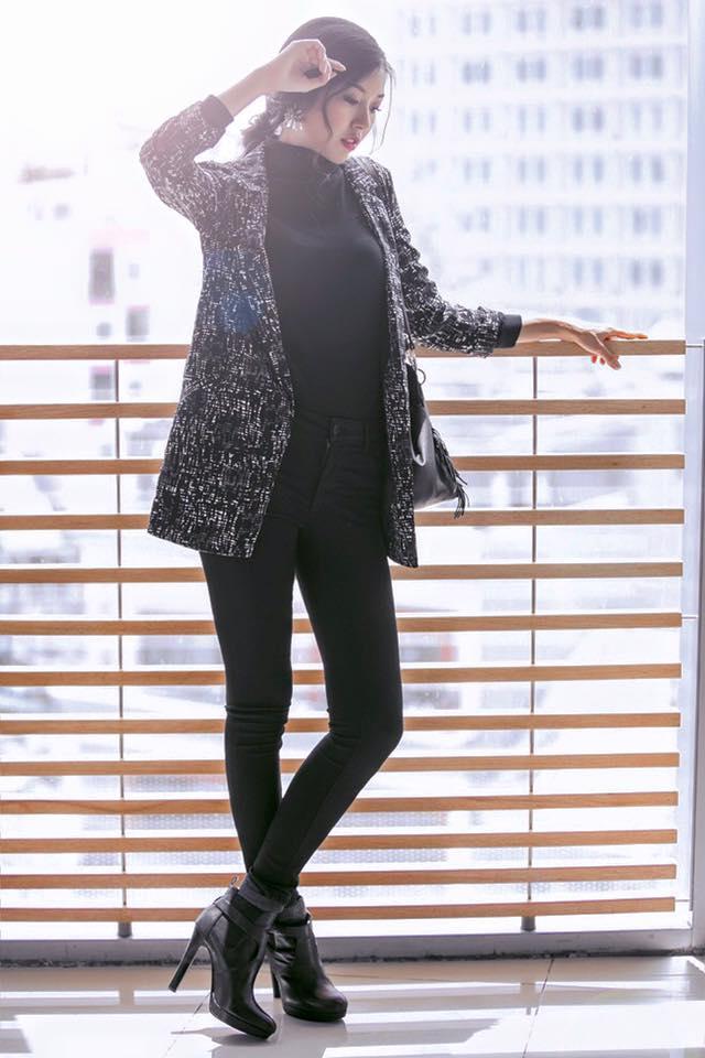 Thúy Vân chọn tông màu tối cho set đồ của mình là áo thun ôm sát, vest dáng dài, quần skinny đen và boots da cùng tông.