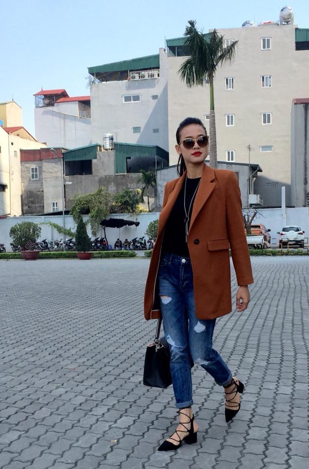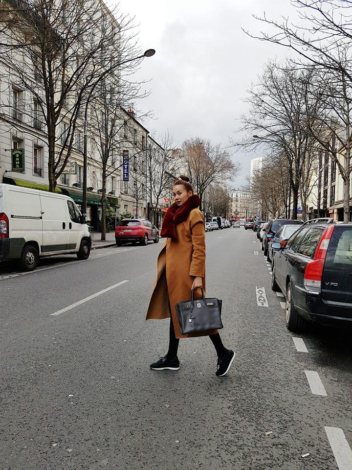 Áo khoác dạ màu camel, giày thể thao, khăn quàng cổ là set đồ giữ ấm khi Thanh Hằng ra nước ngoài.