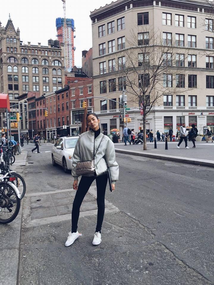 Có lúc người mẫu lại khỏe khoắn với áo khoác dáng ngắn, quần skinny và giày thể thao trắng.