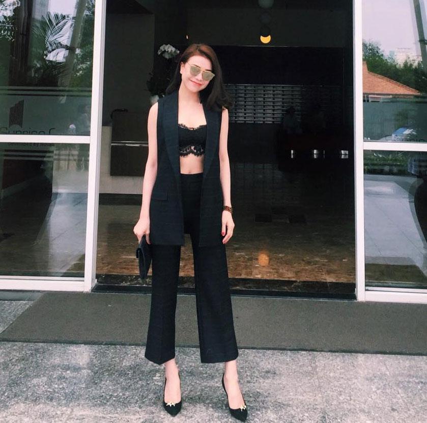 ... Khi lại cực sexy với áo bra ren, áo gile sát nách khoác hờ, quần ống suông hiện đại. Clutch cầm tay, giày cao gót được người đẹp khéo kết hợp cùng tông với trang phục.