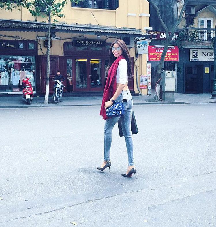 Phạm Hương khéo khoe vòng eo thon gọn với áo ôm sát thiết kế crop top, quần skinny jeans và giày cao gót.