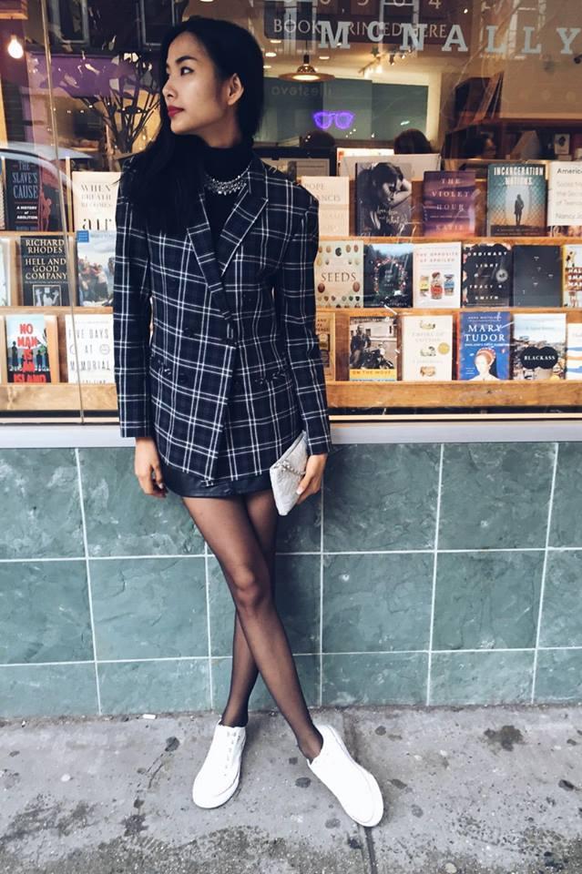 Hoàng Thùy xuống phố đơn giản, năng động với váy ngắn, áo vest kẻ caro và giày thể thao.
