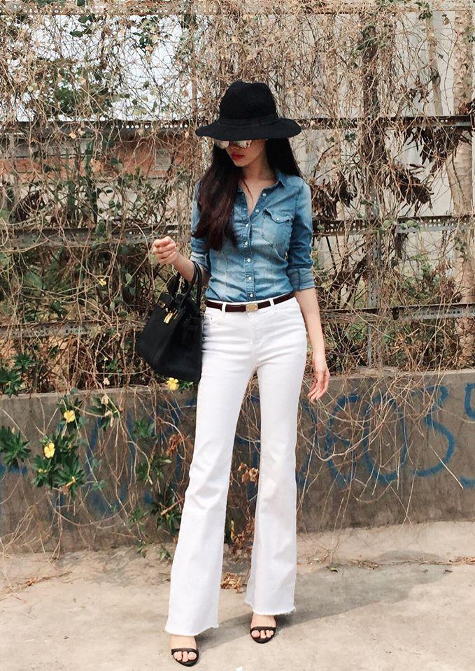 Thủy Anh gây ấn tượng với style cực cá tính và trẻ trung và áo sơ mi denim, quần ống loe màu trắng. Túi xách, mũ rộng vành, sandals được bà xã Đăng Khôi chọn cùng tông khá sành điệu.