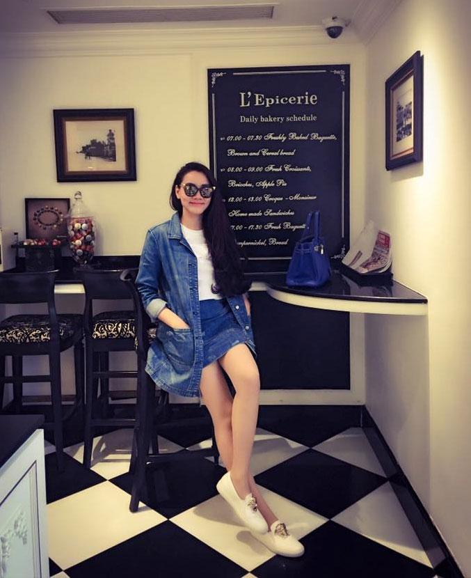 Chân váy ngắn, áo khoác hất liệu denim khỏe khoắn cũng là item được Trang Nhung yêu thích đời thường.