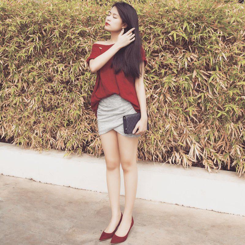 Hoàng Thùy Linh lại khiến nhiều người không rời mắt với style trẻ trung, cuốn hút là áo trễ vai màu đỏ trầm, chân váy ngắn màu tro. Đôi giày mũi nhọn cũng được cô nàng kết hợp cùng tông với áo cực ấn tượng.
