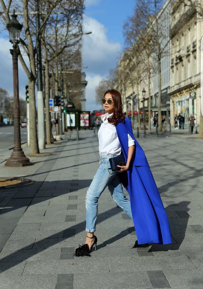 Thanh Hằng xuống phố cá tính với áo sơ mi trắng, quần jeans rách và áo khoác dáng dài màu xanh coban. Đôi giày hàng hiệu là phụ kiện giúp chân dài thêm sang chảnh.