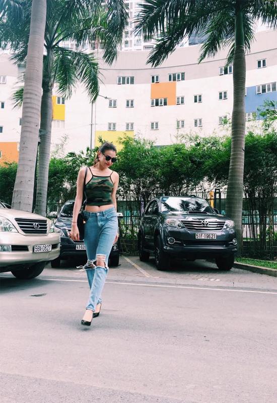 Chỉ cần quần jeans rách đầu gối và áo ba lỗ, giày cao gót, Ngọc Trinh cũng đủ