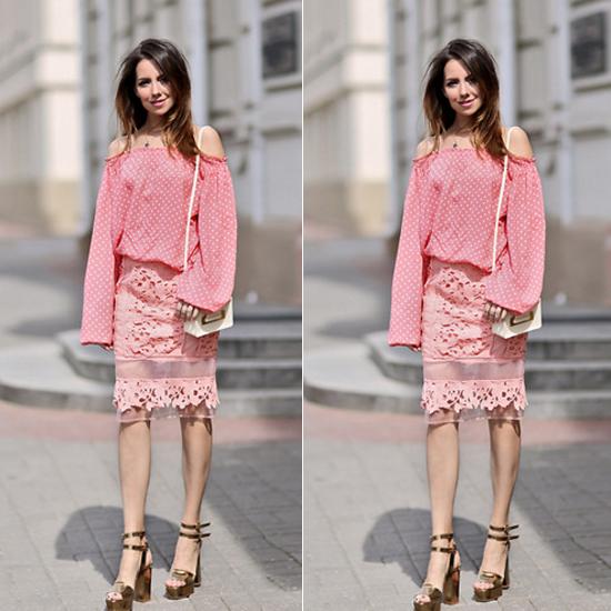 tiết chấm bi hồng kết hợp chân váy ren hồng thời thượng. Xăng đan cao gót giúp
