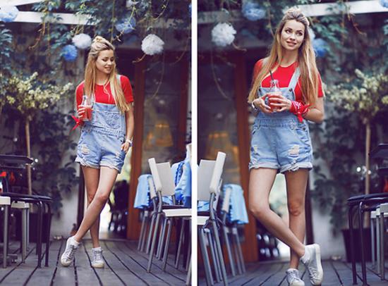 công thức mix đồ "chuẩn đét" gồm áo phông đỏ, quần shorts yếm và giày sneakers.