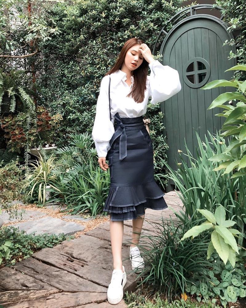Jolie Nguyễn áp dụng công thức mix đồ đen - trắng áo tay bồng điệu đà với chân váy bèo nhún, giầy sneaker Gucci đồng điệu.