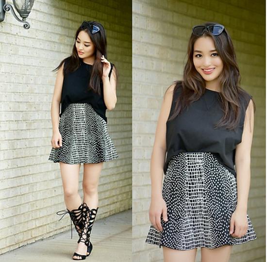 váy mini họa tiết. Thêm đôi xăng đan buộc dây nữ đã khiến bạn đạt sự