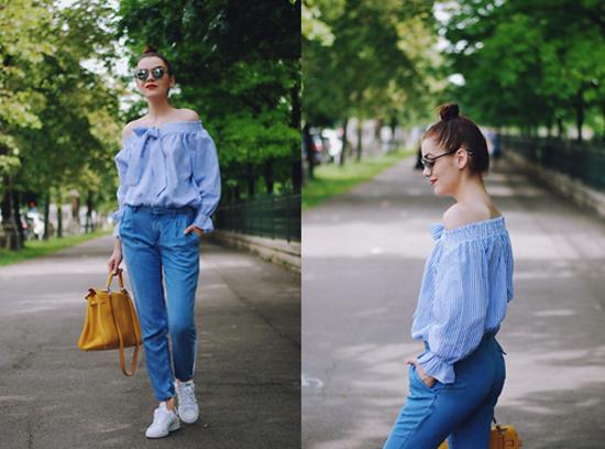 Những ngày đi dạo phố, bạn có thể lựa chọn áo sơ mi trễ vai kết hợp quần jeans