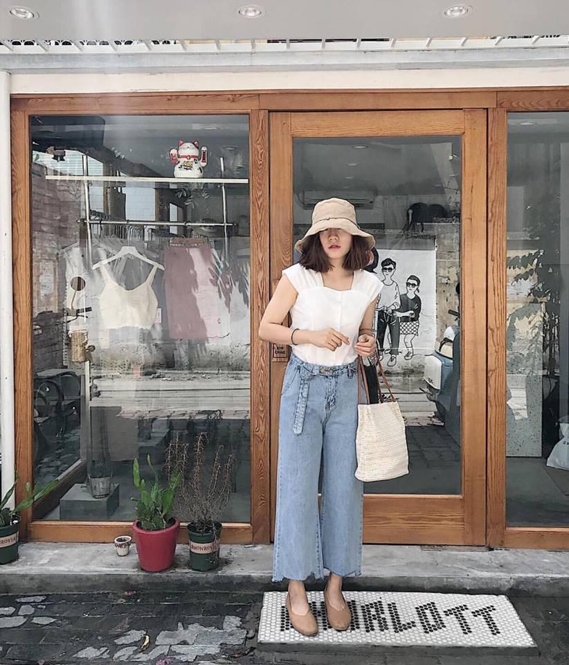Cô bạn Antoetoe diện street style Hàn Quốc với quần jean ống rộng mix áo trắng cùng giầy và túi cói ton-sur-ton.
