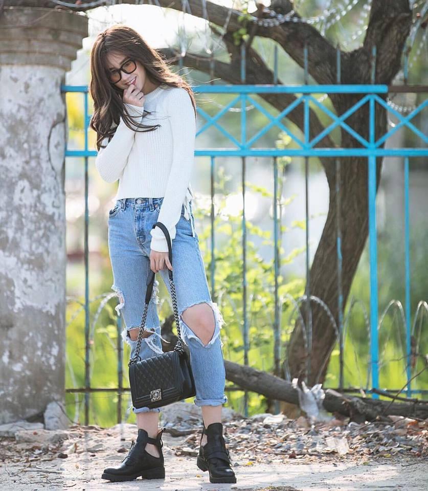 Kiều Trinh cá tính và sành điệu với jean rách gối và boots cut-out.