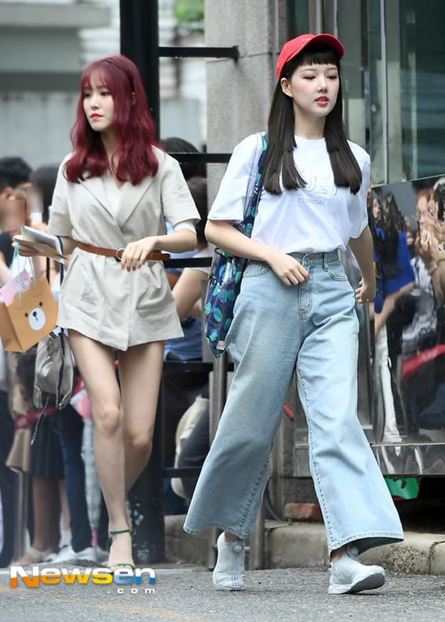 Trong cùng một khung hình, người xem có thể thấy rõ sự đối lập phong cách của hai thành viên nhóm Gfriend. Yerin thì ăn diện khá bụi phủi với áo thun và quần ống loe, trong khi đó Yuju gợi cảm cùng mốt giấu quần.