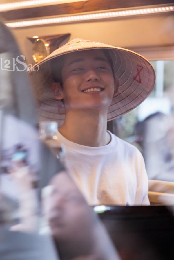 Jung Hae In còn "đốn tim" người hâm mộ khi đội nón lá Việt Nam và nở nụ cười tỏa nắng, vẫy tay thân thiện.