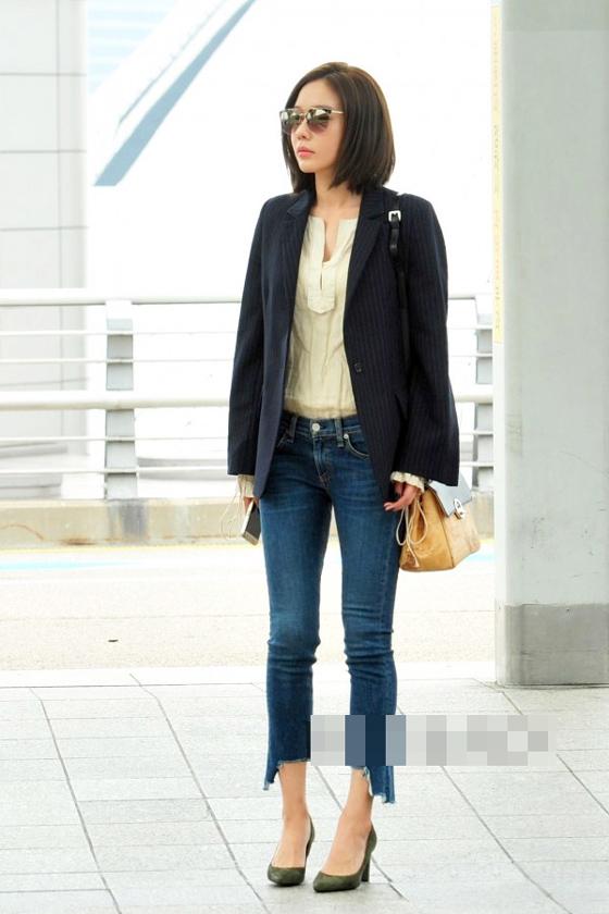 Chiếc quần jeans ống rách nham nhở được Kim Ah Joong lựa chọn cho ngày ra phố. Cô cũng không quên mang theo chiếc túi Alviero Martini.