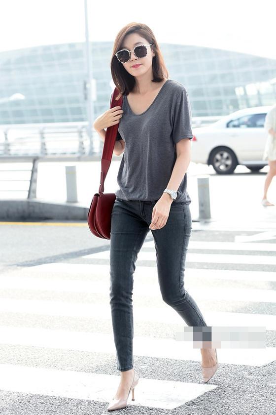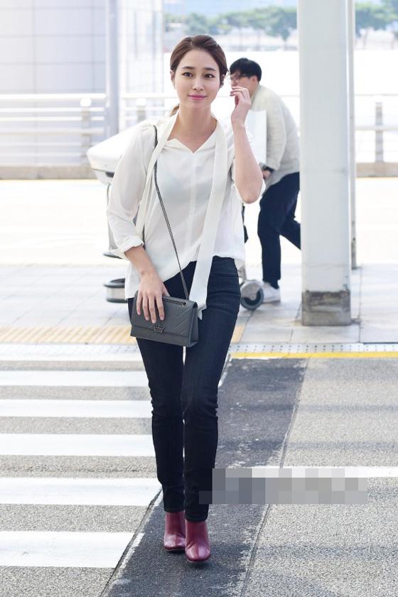 Lee Min Jung yêu thích phong cách giản dị và thanh lịch trong nhiều hoàn cảnh. Áo sơ mi trắng, quần jeans đen và túi đeo J.Estina tạo nên cho cô vẻ ngoài nhẹ nhàng, nữ tính.