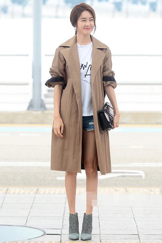 Ở tuổi 36, Lee Yo Won trông rất trẻ trung nhờ quần shorts, áo phông, áo choàng dài và ankle boots hiệu Jimmy Choo.