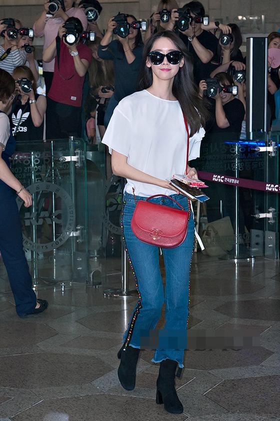 Yoona thu hút mọi sự chú ý với áo sơ mi trắng sơ vin cùng quần jeans ống loe và túi đeo màu đỏ hiệu Chanel.