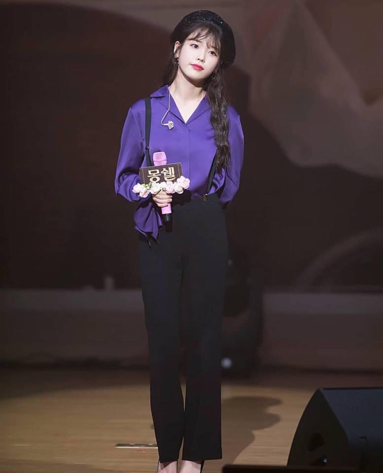 IU bất ngờ đằm thắm cùng áo sơ mi tím hot trend kết hợp quần ống loe vừa phải giúp ăn gian chiều cao đáng kể.