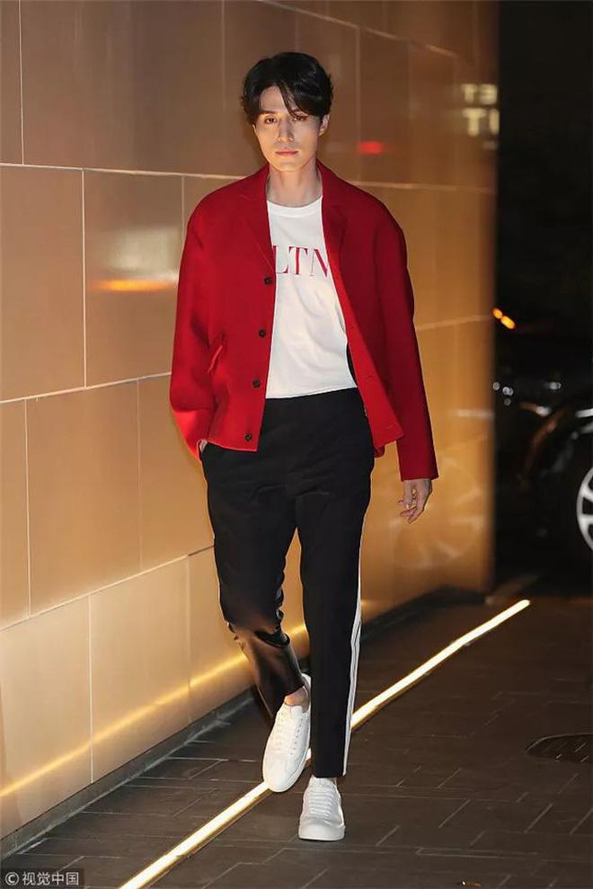 Lee Dong Wook cũng mê mẩn chiếc áo phông của nhà mốt Valentino. Nam diễn viên mix&match năng động cùng quần thể thao, khoác áo đỏ nổi bật.