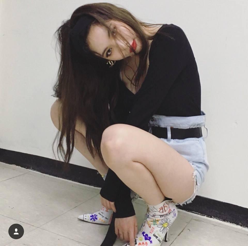 "Nữ hoàng sexy" HyunA trung thành với phong cách gợi cảm cùng áo cổ V xẻ sâu kết hợp quần shorts jeans ngắn cũn và boots họa tiết nổi bật.
