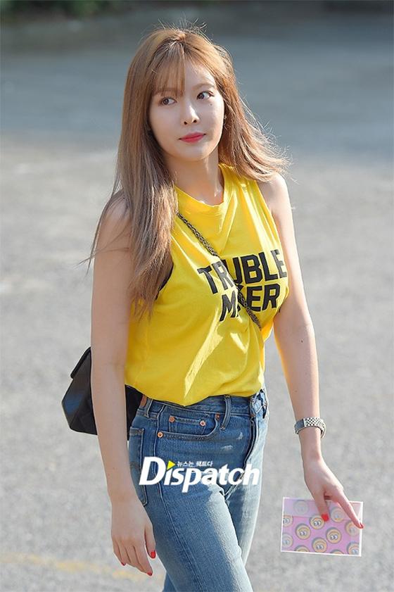 cách kết hợp áo tank top vàng và quần jeans như Hyun A.