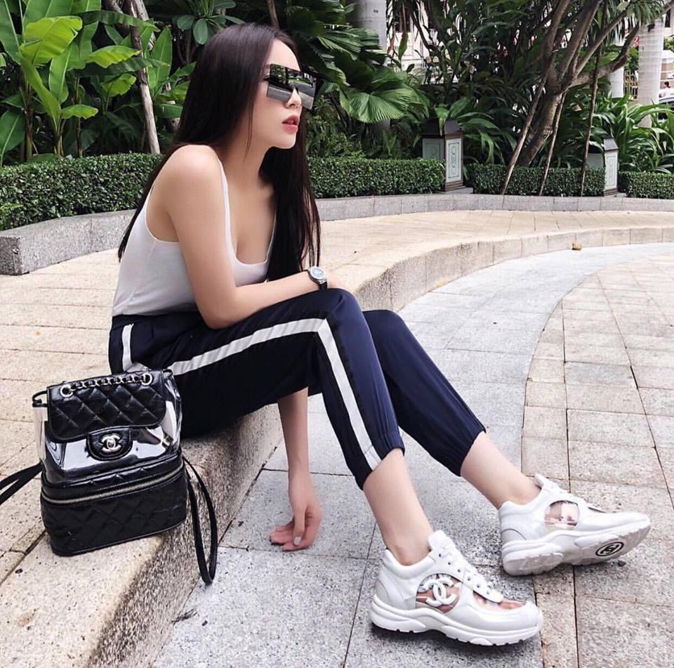 Kỳ Duyên dát hàng hiệu sành điệu bới bộ đôi giầy sneaker và balo đắt đỏ từ thương hiệu Chanel, đồng hồ Hublot tiền tỷ. Người đẹp cũng khéo léo khoe cặp tuyết lê lấp ló trong thiết kế áo trễ nải.