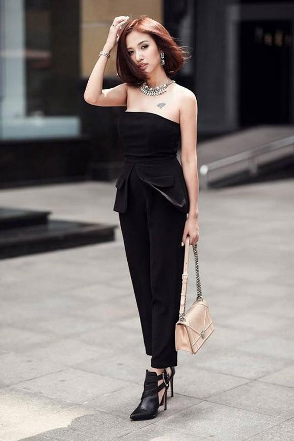 Ngày thu, Vân Hugo khéo léo diện bộ đồ đen hở vai, quây ngực cực kì cuốn hút. Cô còn
