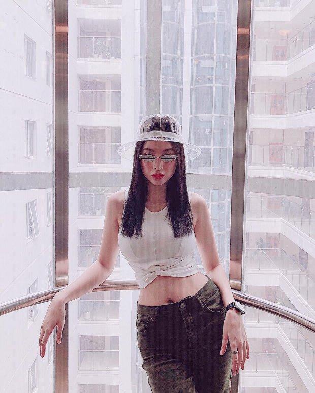 Angela Phương Trinh lại đi đầu xu hướng cùng nón trong suốt mới mẻ. Người đẹp khéo léo mix&match cùng áo croptop khoe eo thon và quần cạp cao.