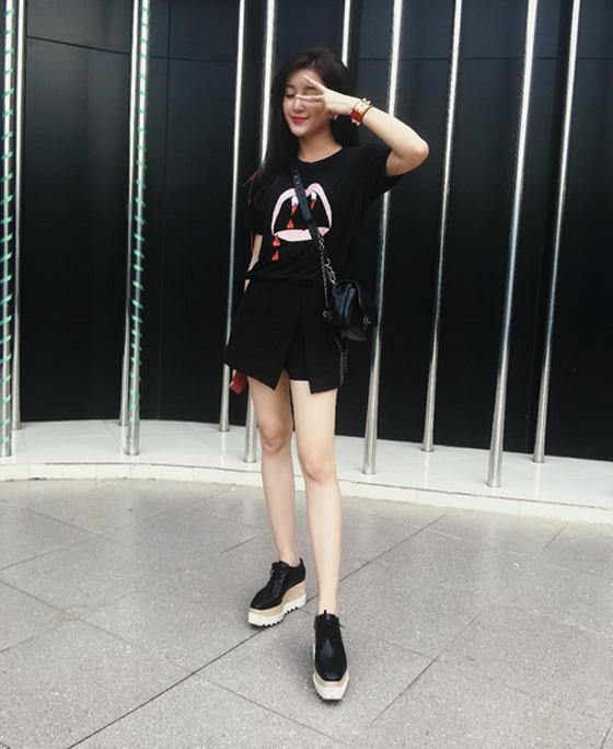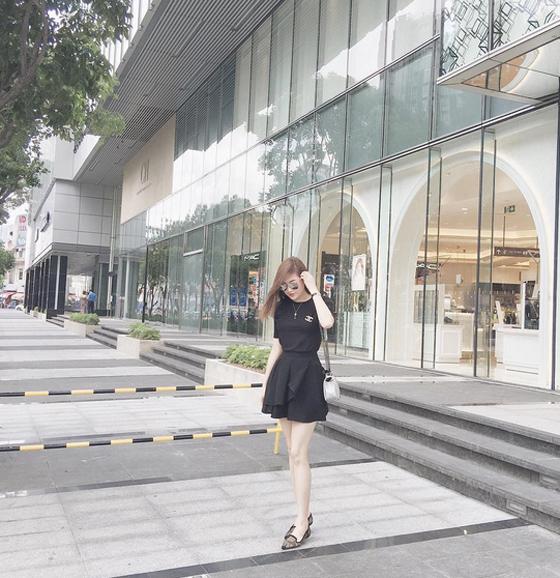 Á hậu Tú Anh khoe làn da trắng ngần, đôi chân nõn nà với bộ đồ đen. Giày bệt
