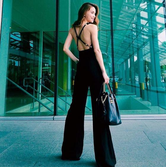 trong jumpsuit đen ống loe, hở lưng gợi cảm kết hợp với túi xách thương