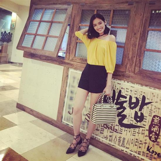 Trúc Diễm xinh đẹp với áo trễ vai vàng và quần shorts đen. Chiếc túi kẻ sọc