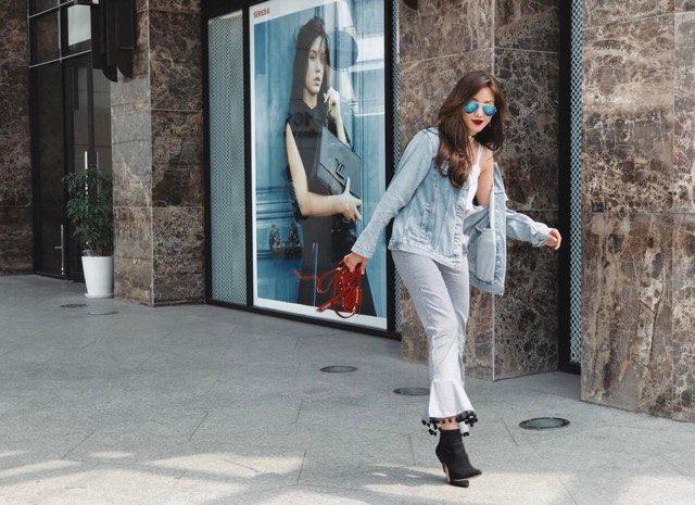 Hot girl Salim cũng lựa chọn áo bra mix cùng khoác jean trễ nải và quần ống loe cách tân độc đáo để dạo phố.