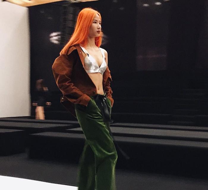 Cô không chỉ khoe vòng 1 vừa vặn mà còn khoe vòng eo đáng mơ ước. Mái tóc cam nổi bần bật thể hiện rõ cá tính của vị giám khảo The Face mùa 2 năm nay.