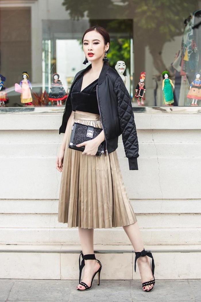 Chân váy xếp ly ánh kim của Angela Phương Trinh là gợi ý tuyệt vời cho các nàng đỏm