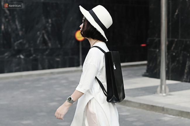 Chiếc balô da lạ mắt trở thành điểm nhấn cho set đồ trắng tinh khôi của cô bạn.