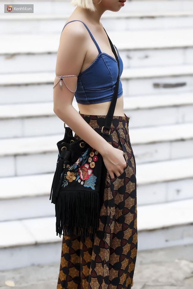 tính mà không kém phần sexy với crop top, chân váy họa tiết và túi tua rua bắt mắt.