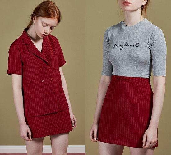 Cô mặc cả bộ áo và váy kẻ sọc màu đỏ rực rỡ đến từ bộ sưu tập