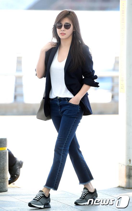 Đối với phong cách sân bay, cô mặc một chiếc áo khoác sọc xanh trắng, t-shirt