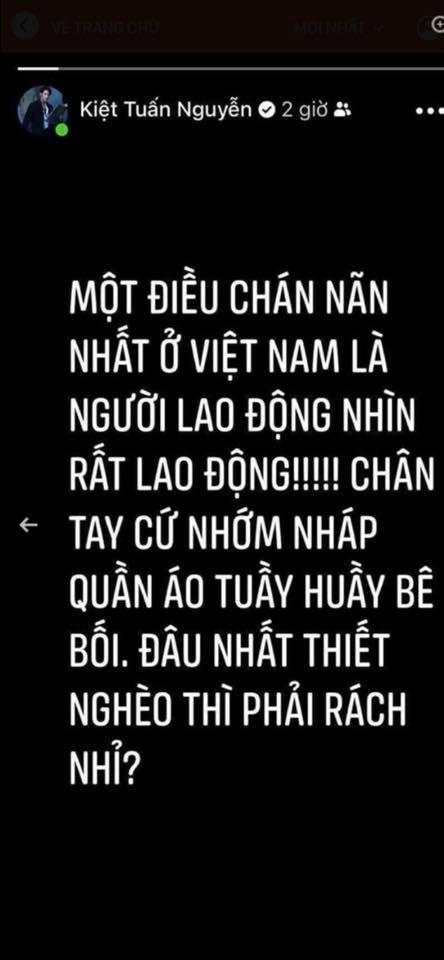 Chỉ mới cách đó vài ngày, nam stylist còn gây tranh cãi gắt gao khi chê người lao động Việt Nam: "Một điều chán nản nhất ở Việt Nam là người lao động nhìn rất lao động! Chân tay cứ nhớp nháp, quần áo tuầy huầy bê bối. Đâu nhất thiết nghèo thì phải rách nhỉ?".