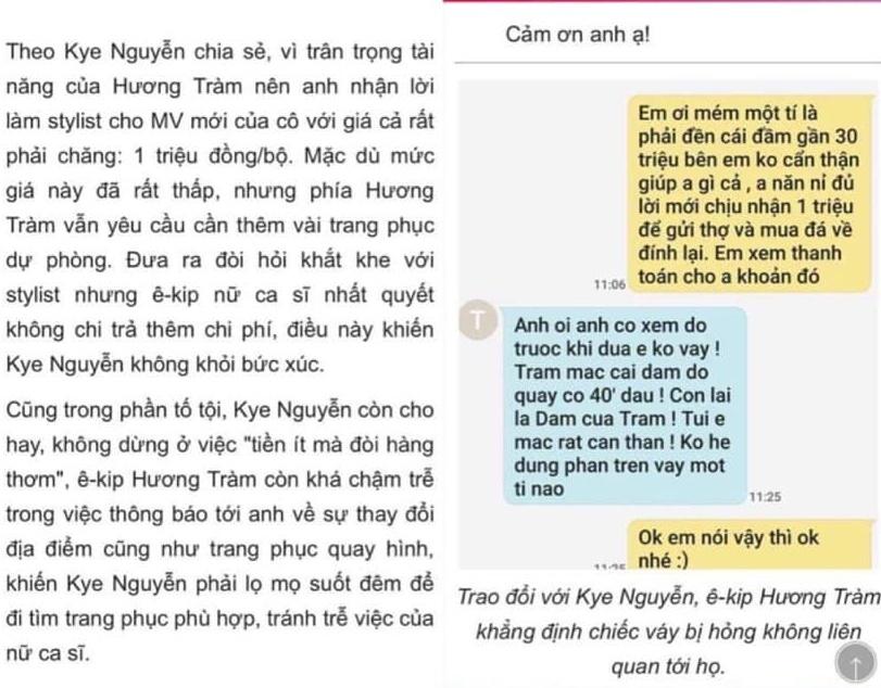 Lật lại quá khứ vào đầu năm 2017, Kye Nguyễn cũng từng khiến dư luận chú ý khi "bóc phốt" Hương Tràm cùng ekip vì làm hư hại trang phục. Tuy nhiên, cả hai bên đã giải quyết êm đẹp khi về sau phía Hương Tràm gửi lời xin lỗi.