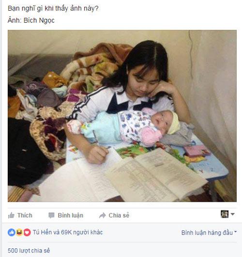 Người chia sẻ bức ảnh không ai khác chính là chị Bích Ngọc, chị gái của nữ sinh. Chị Bích Ngọc hiện sinh sống tại thành phố Nam Định kể lại: "Mình đi sang hàng xóm có tý việc về thì nhìn thấy cảnh này đây ạ. Dì của cháu đang học lớp 8, đi học về là lên phòng bế cháu luôn, đêm dì ngủ tầng dưới mà nghe tiếng cháu khóc cũng chạy lên đòi bế cháu.