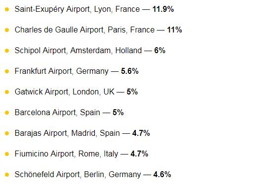 Dưới đây là tỷ lệ phần trăm hàng miễn thuế tại các sân bay có thể rẻ hơn giá niêm yết:
