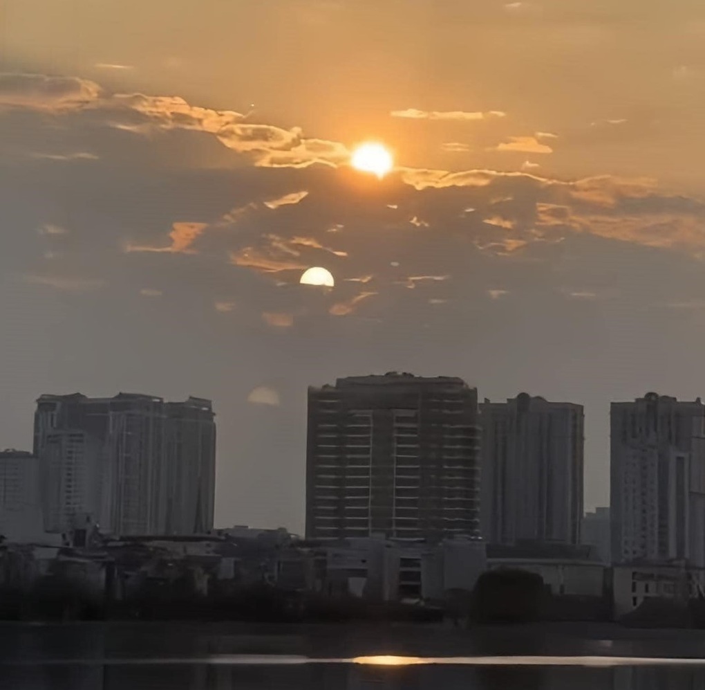 Mạng xã hội vừa lan truyền hình ảnh "hai mặt trời" cùng xuất hiện ở hồ Tây (Hà Nội) vào ngày 11/3. Bức ảnh được nhiều trang thông tin cắt ra từ một video trên mạng xã hội Tiktok để chia sẻ lại.