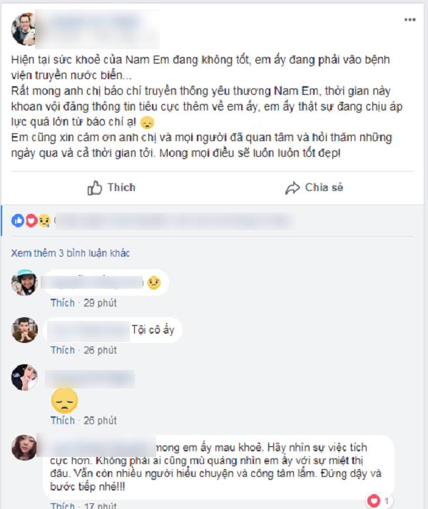 Cụ thể, quản lý của Nam Em viết: "Hiện tại sức khoẻ của Nam Em đang không tốt, em ấy đang phải vào bệnh viện truyền nước biển... Rất mong anh chị báo chí truyền thông yêu thương Nam Em, thời gian này khoan vội đăng thông tin tiêu cực thêm về em ấy, em ấy thật sự đang chịu áp lực quá lớn!.