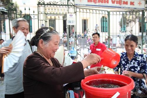 Tại trước cửa Bệnh viện K Trung ương (Quán Sứ - Hà Nội), từ 8 giờ sáng đến khoảng 10 giờ sáng ngày 5/6, bà Thủng đã phát hết khoảng 50 lít nước vối cho những người dân lao động, người bệnh và người nhà bệnh nhân.